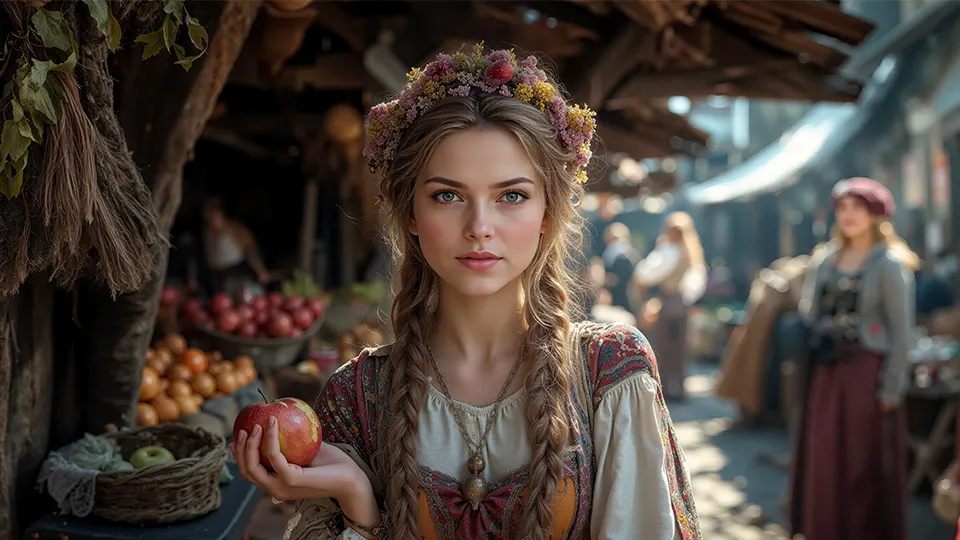 Among the crowd, Aden — a gaunt young man — paused as Kateryna, a farmer's daughter, watched him from behind her basket. Her braids were threaded with wildflowers, her eyes steady, as she recognized the look of hunger on his face. It was the same look her family had worn before they found shelter in the village.